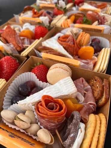 Charcuterie (pronounced shahr-koo-tuh-ree) is a beautifully arranged selection of meats, cheeses, crackers, fruits, nuts, and other accompaniments. Our boards and boxes are designed to be both delicious and visually stunning.